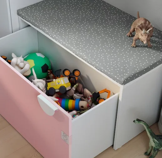 A toy storage bench is a functional and stylish option that can be used to store toys and provide seating in your child's room. To make a toy storage bench, you'll need to build a wooden bench with a hinged lid and add storage compartments inside. You can also add cushions to the top of the bench to make it more comfortable to sit on.